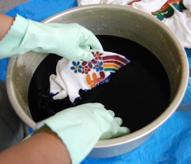 9.絵の部分がロウで覆われている 為 染料をはじきます (☆長時間染めている間にカチカチになったロウが 割れてきてヒビが入り染料が潜入してきます) It dyed without wax part. at the time, It got some wax cracks. |