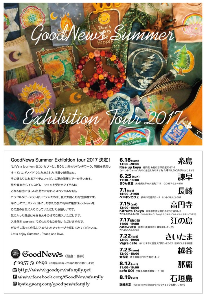 GoodNews 夏展 開催決定 ♪ みなさん こんにちは☆ GoodNews夏展の開催が決定しました! 今回は埼玉、神奈川、沖縄の3箇所です。 是非、どこかで皆さんとお会いできたら嬉しいです~♪ Enjoy Summer !