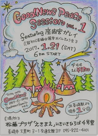Good News Peace Session vol.1 featuring 座間宮ガレイ (超初心者編☆選挙勉強会) 2017.1.21 (sat) 6pm start fee 1300円 place 松藤プラザ「えきまえ」 いきいきひろば4号室 長崎市 大黒町3-1交通会館3階 095-822-4101 ![]() |