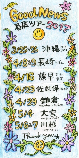 GoodNews春の個展ツアー開催決定♪ こんにちは♪ 待ちに待った春が やってきましたね☆ 皆様お元気でしょうか? ポカポカ陽気の春、 家族3人で春風に乗って “GoodNews個展ツアー” を行います。 4月20日 故郷の埼玉からスタートして 長崎までの On The Road です♪ お近くの方は是非 GoodNewsファミリーに 会いに来てくださいね♪