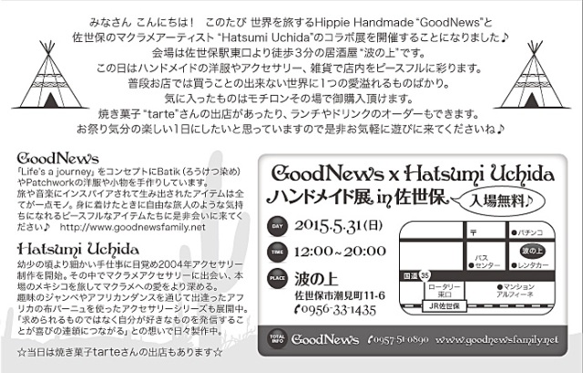 GoodNews Winter Tour 2016 開催決定 ![]() みなさんこんにちは♪ 約5ヶ月間のフィリピン滞在から帰国し いよいよ1年ぶりにGoodNews個展ツアーを開催します。 今冬のツアーは 諫早→鹿島(佐賀)→長崎→川越(埼玉)→大宮(埼玉) の全5箇所です。 お出迎えする作品は全てハンドメイドで制作した洋服と雑貨達。 旅や音楽、自然からのインスピレーションをもとに、 手のぬくもりや、ひとつひとつに吹き込まれた 愛と平和のメッセージを受け取っていただけると嬉しいです。 全てが世界に1つの一点もの、 どなたのもとへ旅立っていくのか 今回も出逢いを楽しみにしたいと思います。 皆さんにお逢いできるのを心より楽しみにしています。 11月26(土)27(日) 諫早 GoodNewsHouse 展 26(土) 12:00 - 19:00 27(日)12:00 - 17:00 (会場) GoodNewsHouse 長崎県 諫早市 多良見町 シーサイド 1-97 今回初の自宅で開催する展示販売会です。 自宅ならではなアットホーム&リラックスな空間をお楽しみ下さい。 どなたでもお気軽にどうぞ。 12月3日(土) 佐賀 鹿島 Hamashuku Kurabito 展 12:00 - 19:00 (出店) BIG FAMILY (会場) Hamashuku Kurabito 佐賀県 鹿島市 浜町八宿乙2688 今回初となる佐賀展会場は 備前浜宿の酒蔵通りの素敵なギャラリー Hamashuku Kurabitoさん。 同じ通りにはキャンドルアーティストまたたびさんのお店があったり タイの雑貨屋さんがあったりと他にも素敵なお店が並んでいます。 酒蔵通りだけあってたくさんの おいしい日本酒を試飲することもできますよ♪ 是非お気軽に遊びに来てくださいね。 12月10(土)11(日) 長崎 りぼん展 (土) 12:00 - 18:00 (出店)またたび、BIG FAMILY (LIVE) SAARA (日) 11:00 - 18:00 (出店) SHIP SIDE(フェアトレード飲食品、雑貨) (会場) りぼん 長崎県 長崎市 万屋町 1-23 http://ribon.main.jp/ 長崎市の会場は今回初となる万屋町のりぼんさん。 店内奥の広いスペースをお借りして開催します。 2日間にわたり仲良しの出店仲間と楽しくやる予定です。 是非みなさまお気軽に遊びに来てください。 12月24(土)25(日) 川越 Pot-Shot 展 12:00 - 20:00 (出店) にじわぱん(25日のみ) (会場) Pot-Shot 埼玉県 川越市 岸町 2-30-20 http://pot-shot.net/ Xmas 2daysはヘンプウェアと雑貨の店 Pot-Shot さんの2階が会場となります。 Pot-Shotさんの素敵な洋服や雑貨達も一緒に楽しめます。 是非ぜひXmasはこちらでお会いしましょう♪ 12月29日(木) 大宮 Vajra cafe展 12:00 - 21:00 (会場) Vajra cafe 埼玉県 さいたま市 大宮区 大門町 3-22-1 第2新栄ビル2階 最終地は大宮Vjra cafeです。 忘年マーケットとして皆でワイワイできればいいなと思っています。 お楽しみに♪ Thanks ! |