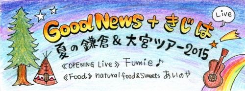 ☆ GoodNews + きじは 夏の鎌倉&大宮ツアー2015 決定 ☆ ![]() ★7月25日(土) 鎌倉展&LIVE (場所) Wander Kitchen 神奈川県鎌倉市御成町10−15 0467-61-4751 http://wanderkitchen.net/ (個展) 昼12時~夕方6時まで (LIVE) 夕方6時~7時ごろまで (打ち上げ) 夜7時~8時まで ★7月26日(日) 大宮展&LIVE (場所) Vajira cafe & 美容室AQABAL さいたま市 大宮区 大門町 3-22-1 第2新栄ビル 2 & 3 階 Vajira 070-5559-1848 AQABAL 048-642-8880 (2階 個展) 午後1時~夜10時 (3階 LIVE) 夕方6時頃から ★3階にて“Addict Candle”のLiveデコ&Candle販売あります★ |
